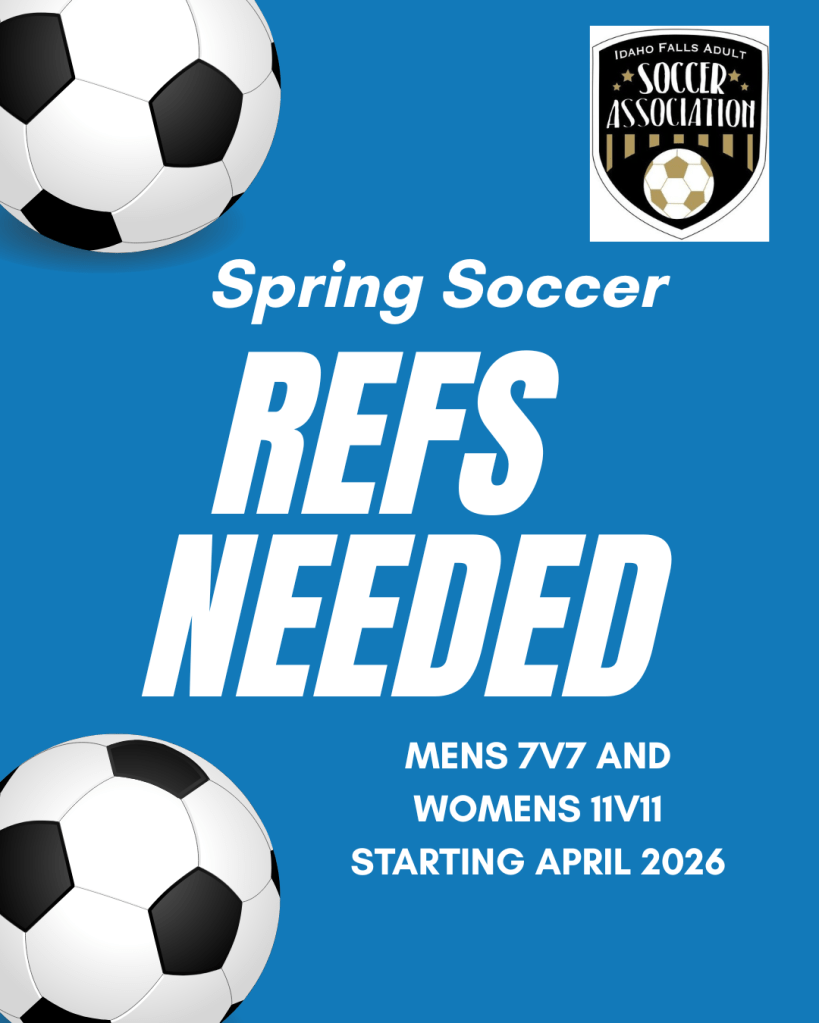 In search of referees for Spring Soccer in Idaho Falls! Starting April: Monday nights Women’s 11v11 and Wednesday nights Men’s 7v7 matches!